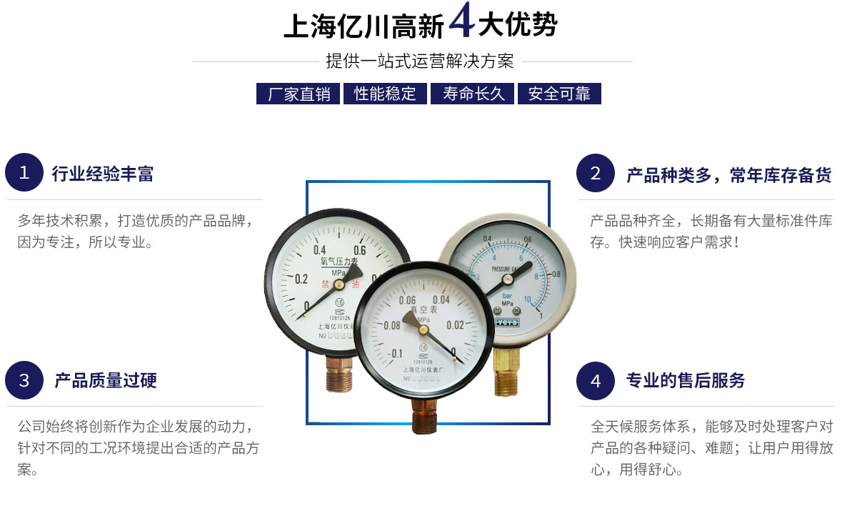 億川高新儀器儀表有限公司專業(yè)生產(chǎn)各類規(guī)格型號(hào)的壓力表,產(chǎn)品包括普通壓力表,不銹鋼壓力表(不銹鋼耐震YB-60/YB-100/YB-150),真空壓力表,氧氣專用(YQ-60/YQ-100/YQ-150),普通(磁助式)電接點(diǎn)壓力表(耐震電接點(diǎn))YXC-100,耐震壓力表YN-100,隔膜壓力表YTPML-100,膜片壓力表YPT-100,膜盒壓力表YE-100,矩形壓力表YEJ-100,雙針壓力表YTZ-100,氨氣壓力表YA-100,遠(yuǎn)傳壓力表YTZ-150,防爆電接點(diǎn)壓力表,軸向壓力表等壓力表系列產(chǎn)品。 億川高新始終以"質(zhì)量求生存,創(chuàng)新為突破。顧客為中心"的發(fā)展理念,通過(guò)引進(jìn)國(guó)外先進(jìn)技術(shù),歷經(jīng)二十多年的技術(shù)沉淀,生產(chǎn)出一系列在消費(fèi)者中有著良好口碑的產(chǎn)品。